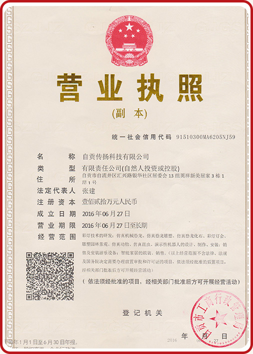 仿真恐龍服又稱恐龍皮套,是一種人可以穿起來(lái)的像恐龍一的奔跑,做出各種動(dòng)作、發(fā)出叫聲的一種新型表演服裝道具;自貢傳揚(yáng)文化有限公司就是專業(yè)從事仿真恐龍衣服研發(fā)制作的一